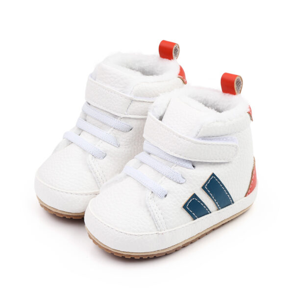Baschetii bebe albi sunt un articol vestimentar de nelipsit din garderoba bebelusului tau. Modelul este confectionat din piele ecologica, iar interiorul este captusit, fiind perfecti pentru zilele racoroase. Talpa este accesorizata cu buline antiaderente ce ofera siguranta.