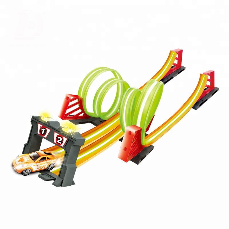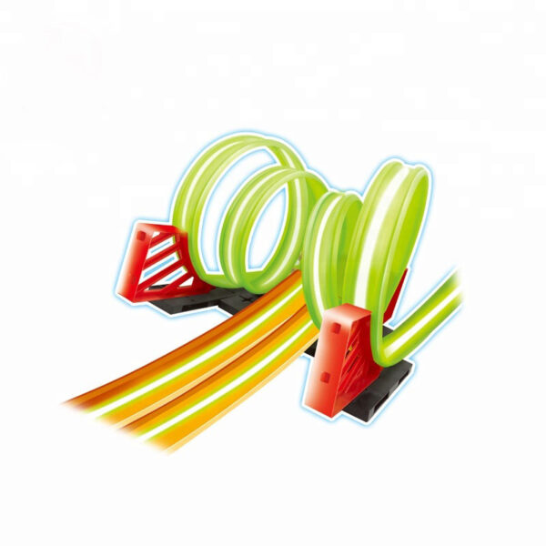 Circuitul dublu de curse de masini se asambleaza si este format din 2 loop-uri si o linie de finish. Este perfect pentru un pasionat de curse de masini.