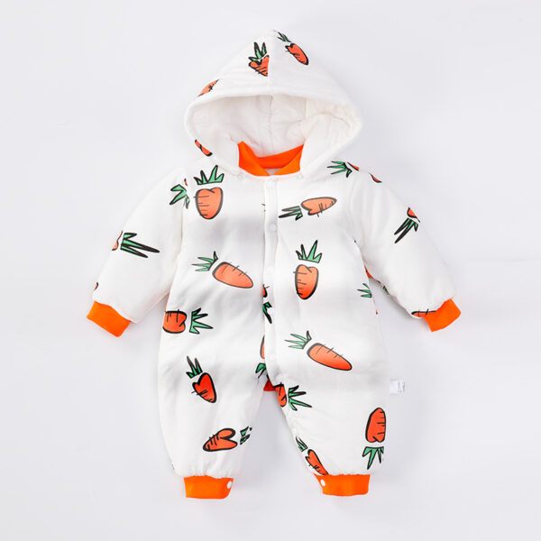 Combinezon plusat imprimeu morcovi de nelipsit din garderoba bebelusului dumneavoastra in sezonul rece. Un combinezon plusat, captusit cu un croi lejer ce permite imbracarea facila a acestuia.