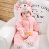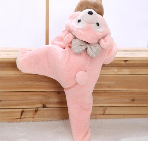 Combinezon plusat ursulet roz confecționat din pluș moale, cu glugă si urechi, are fermoar pe toată lungimea în față prevăzut cu apărătoare de bărbie. Combinezonul nu contine manusi si nici papucei.