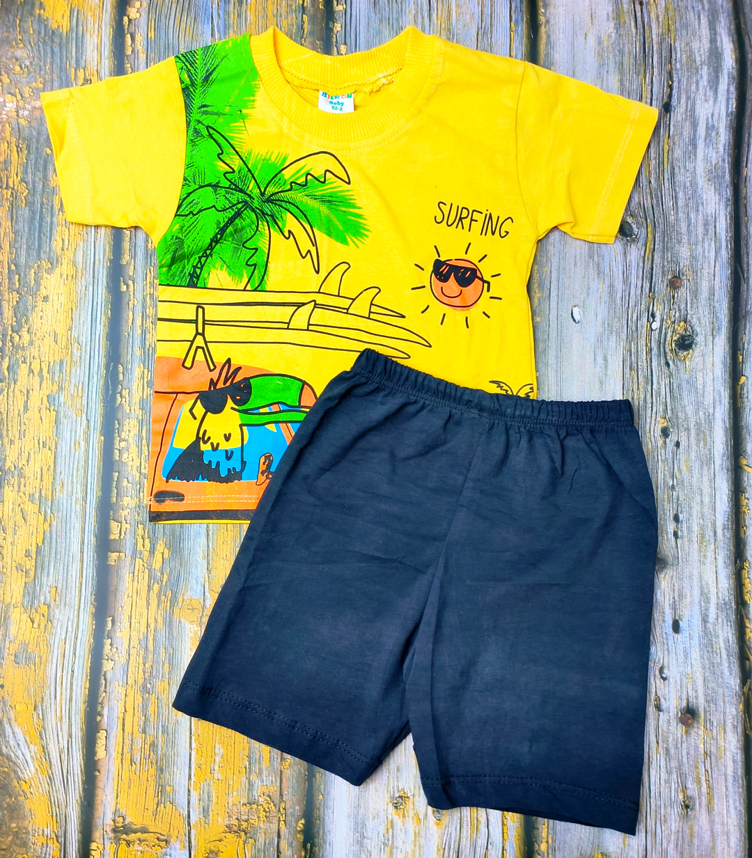 Compleul pentru baietei foarte confortabil si lejer de purtat este potrivit pentru zilele calduroase. Setul este format dintr-o pereche de pantaloni scurti si un tricou.