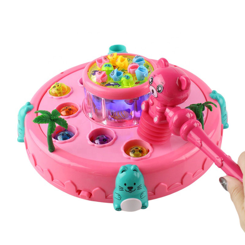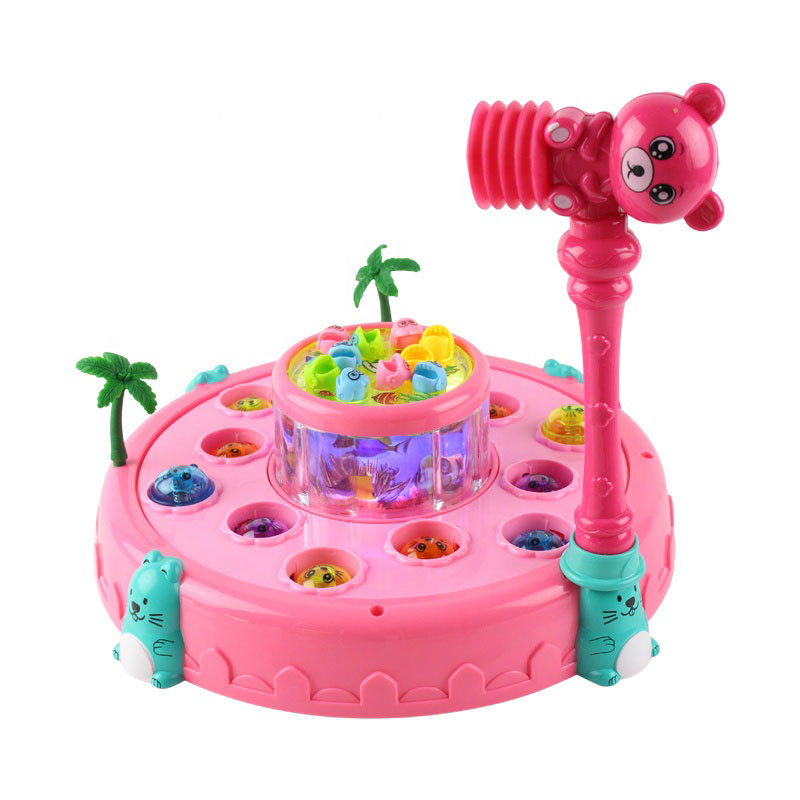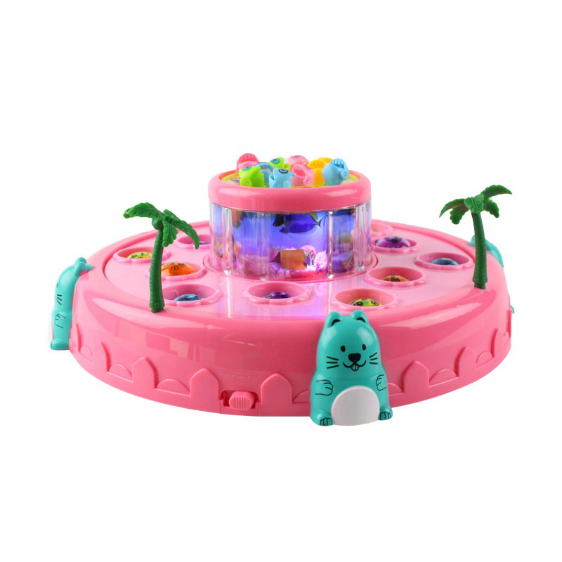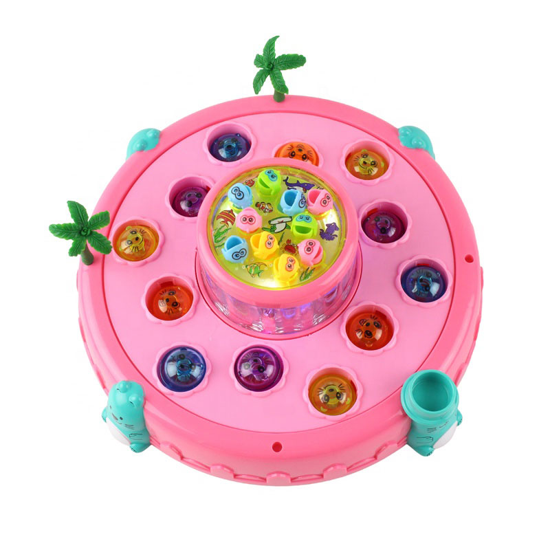 Jucaria interactiva pescuit constituie o roata care se invarte si poti sa pescuiesti micutii pesti din mijlocul acesteia, iar in exteriorul acesteia se invart bilute pe care le oti lovi cu ciocanelul inclus in pachet cand acestea se ridica.