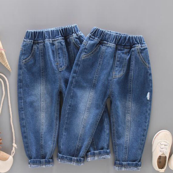 Pantaloni denim baietei cu elastic in talie, un articol vestimentar casual, de nelipsit din garderoba copilului dumneavoastra. Pantalon lejer cu buzunare, dintr-un denim moale.