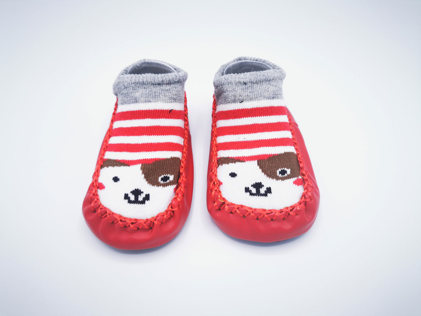 Papucei rosii catelus cu talpa din piele ecologica, antiaderenta, utile atat in interior, cat si in aer liber. Ofera micutilor libertate de miscare, siguranta si protectie.
