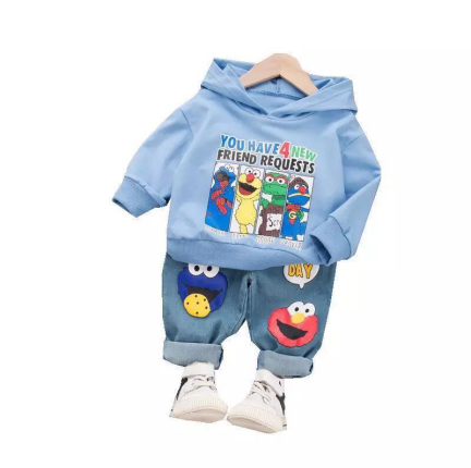 Set albastru imprimeu vesel ce nu ar trebui sa lipseasca din garderoba bebelusului dumneavoastra. Setul de hainute contine un hanorac cu gluga si un pantalon din denim cu imprimeu vesel.
