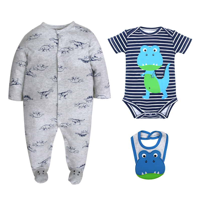 Set hainute baietel model dinozaur de nelipsit din garderoba bebelusului dumneavoastra. Setul contine o salopeta cu maneca lunga si botosei, un body si o bavetica.