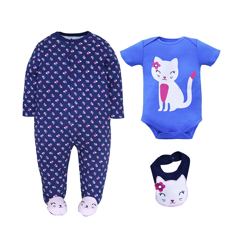 Set hainute model pisicute de nelipsit din garderoba bebelusului dumneavoastra. Setul contine o salopeta cu maneca lunga model cu botosei, un body si o bavetica.