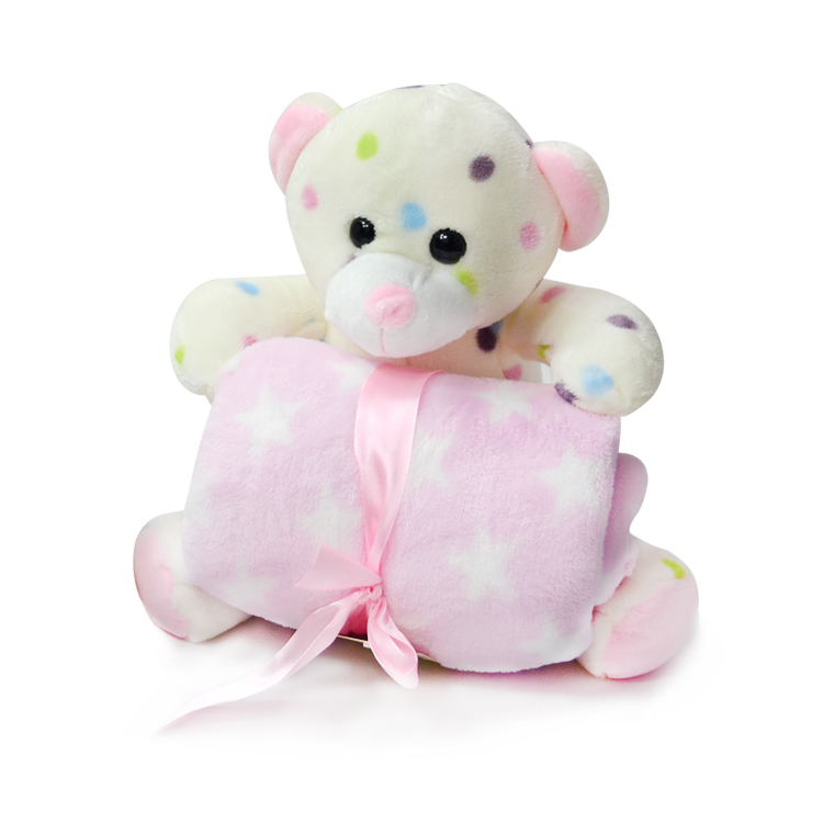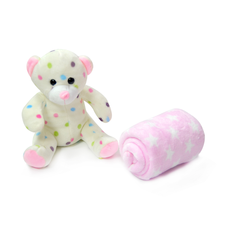 Setul ursulet cu paturica stelute este combinatia perfecta pentru un cadou practic. Setul include un ursulet din plus cu bulinute si o paturica moale potrivita pentru pielea sensibila a micutilor.